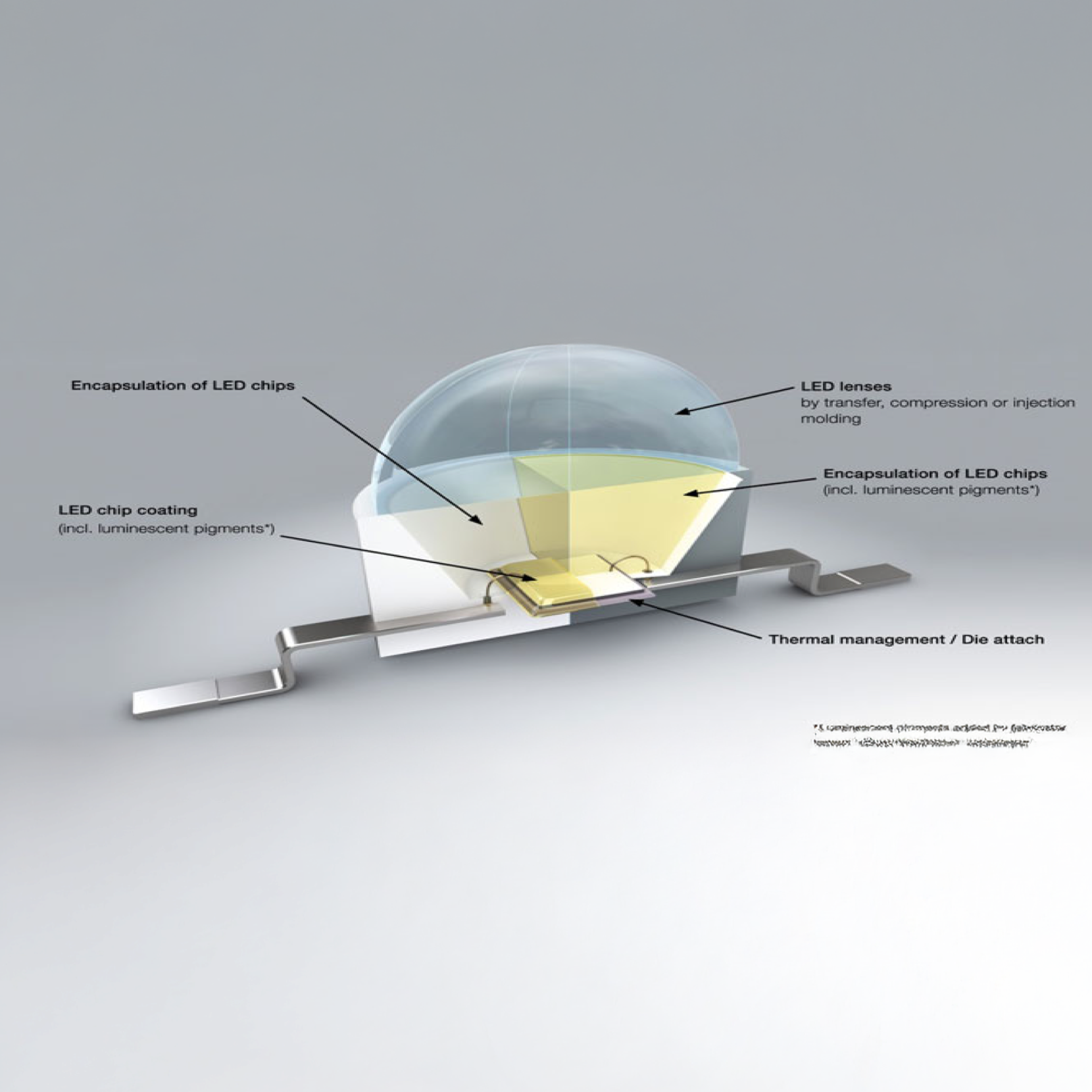Large area displays composed of LED panels are being used for advertisement and announcements, for example in sport arenas. There can be up to millions of RGB-LEDs in one display. Each RGB-LED contains a blue, a green and a red emitting semiconductor chip. By steering the currents dedicated to each of these 3 chips, a large variety of colors can be achieved my mixing the emission spectra. Thermally stable silicones are used as encapsulants for the chips in the package.