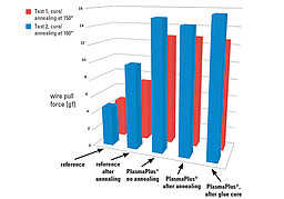Working together with our partners, Plasmatreat has developed a special, ultra-thin nanocoating to address this problem. The PlasmaPlus® anti-bleeding coating prevents wetting of the contact surfaces and strengthens the wire connection, an added benefit which can be clearly demonstrated by wire-pull tests. The coating does not affect the bond between the adhesive and the lead frame. It is applied before chip bonding and remains extremely stable when stored under dry conditions.