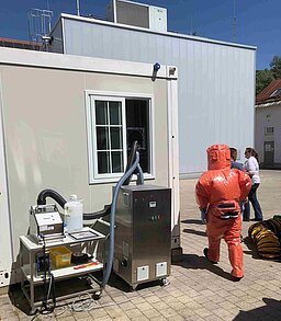 The project team has already started with the first test runs under practical conditions. The new Plasmatreat MoPlas2Dekon-PRO prototype has decontaminated all surfaces in a 30m3 office container at the Fraunhofer IVV in Freising within 30 minutes under real-life conditions.