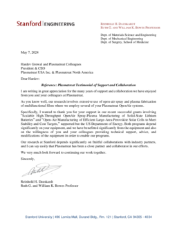 Our research at Stanford depends significantly on fruitful collaborations with industry partners, and I can say easily that Plasmatreat has been a close partner and collaborator in our efforts.
